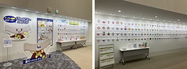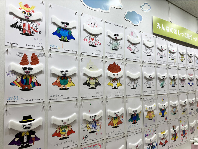 汚れを防ぐサンコーのアイデア商品『おしっこ吸う~パット』のキャラクター「おしっこ吸うパットマン」を作るワークショップスペースでは、台紙に商品、目と口のシールを貼り、色を塗って、自分だけの作品を完成させることができます。1週間で200点以上もの作品が集まり、多くの方に楽しんでいただくことができました。完成した作品は、引き続き弊社の本社にて展示いたします。