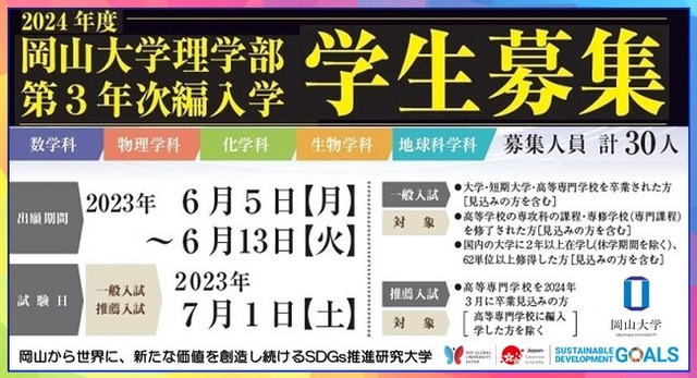 国立大学法人岡山大学(本部:岡山市北区、学長:那須保友)の理学部では、第3年次編入学を実施します。