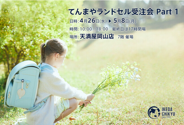 オリジナルランドセル「地球NASAランドセル(R)」の企画・販売を行う池田地球株式会社(本店:東京都港区:代表取締役 村尾光一)は、天満屋岡山店7階の催場にて4/26(水)~5/8(月) に開催される「てんまやランドセル受注会 Part1」に参加いたします。