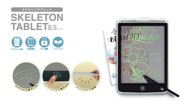 特徴:「お仕事お疲れさま。レンジで3分チンしてね。」「冷蔵庫にシュークリーム入ってるよ、食べてね。」…などの家族の伝言。ワンプッシュで消去できて、また新たにメッセージが書けます。そして商品名の通り、半透明の液晶だからイラストの上に置いたら「あらカンタン!」なぞってイラストが描けます。