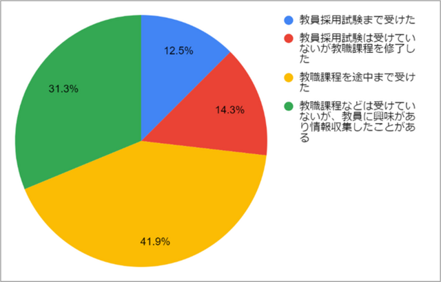 調査結果2.の回答者に、教員志望だったがやめた、もしくは後ろ向きになったのはどの段階か質問したところ、「教職課程を受ける前の段階」が5割弱(46%)、「教職課程で座学やスクリーニングの受講/試験勉強をしている段階」が33.2%で、学校で教育実習を受ける前に8割の学生が労働環境などの情報を収集して後ろ向きになったことがわかりました。