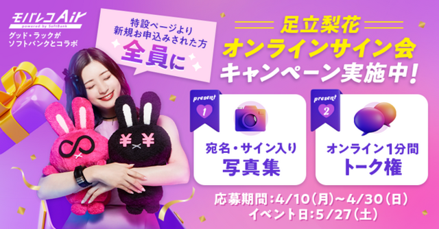 「社会をにぎやかに!」を企業理念に、通信回線やスマートフォンなどの通信インフラサービスを取り扱うオールコネクトグループの株式会社 グッド・ラック(本社:福井県福井市、代表取締役:斉藤 鋭一)は、モバレコAirアンバサダーの足立梨花さんと1分間オンラインで会話+宛名、サイン入り写真集がもらえるキャンペーンを実施いたします。