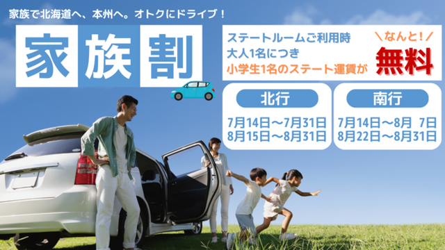 新日本海フェリーは、お車でご乗船の場合、大人1名様につき小学生1名様のステート運賃が無料になる『家族割』を発表しました。