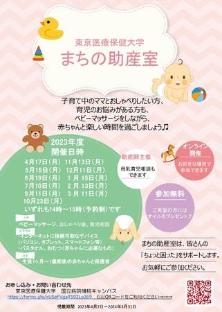 学校法人 青葉学園が運営する東京医療保健大学(本部:東京都品川区、理事長:田村哲夫、学長:亀山周二、以下本学)は、東が丘看護学部(学部長:山西文子)の助産師によるベビーマッサージ等の母子支援クラス「まちの助産室」をオンラインにて計11回開催します。