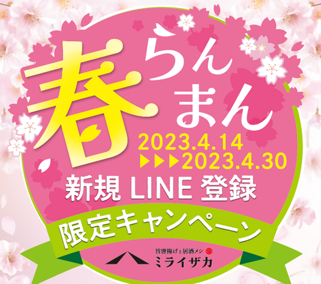ワタミ株式会社(本社:東京都大田区、以下ワタミ)が展開する「ミライザカ」の直営66店舗で2023年4月14日(金)~2023年4月30日(日)までの期間で「新規LINE登録限定キャンペーン」を開催いたします。期間中に新規でミライザカ公式LINEをご登録いただくと抽選で当日使える2000円OFFクーポンが当たります。