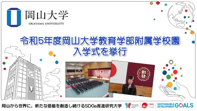 国立大学法人岡山大学(本部:岡山市北区、学長:那須保友)は、2023年4月11日~14日に、令和5年度岡山大学教育学部附属学校園(幼稚園、小学校、中学校、特別支援学校)の入園・入学式を行い、幼稚園(3歳児 44人)、小学校(105人)、中学校(180人)、特別支援学校(小学部3人、中学部5人、高等部8人)の計345人が入学しました。