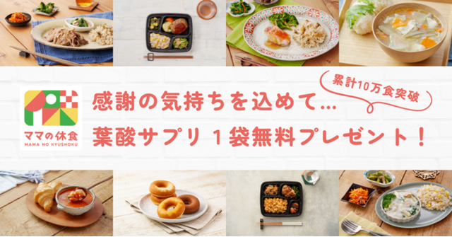 ママの休食に共感し、応援してくださっている方々に感謝の気持ちを込めて、お弁当定期便のプレママ向けプランを新規で購入された方を対象に、「葉酸サプリ30日分1袋を無料」でご提供いたします。
