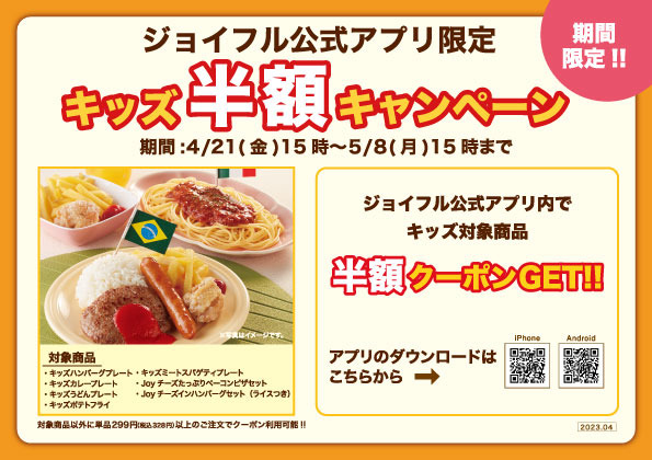 ジョイフル全店舗で期間中何度でも使用可能なキッズメニュー半額クーポンを「ジョイフル公式アプリ」の会員様限定で配布いたします。
