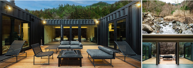 「郷音」は、山梨県大月インターから車で20分ほどの山中にひっそりたたずむ隠れ屋のようなコンテナ型Private Villaです。予約からチェックインまで全てWeb上で完結、各棟にはそれぞれ4台の駐車スペースが備わっており、帰りまで誰とも会わない完全なプライベート空間を満喫することができます。