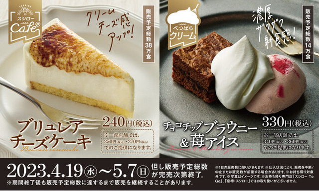 株式会社あきんどスシロー(本社:大阪府吹田市、代表取締役社長:新居 耕平)は、“スシローカフェ部”から過去累計90万食以上売り上げた人気のとろけるチーズケーキ「ブリュレアチーズケーキ」をさらに美味しく改良を重ねた、新たな「ブリュレアチーズケーキ」を、4月19日(水)より全国のスシローにて販売いたします。さらに、こだわりの“べつばらクリーム”シリーズの新商品として「チョコチップブラウニー&苺アイス」も同日より登場いたします。