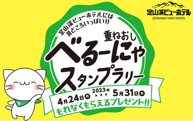 定山渓ビューホテルの館内6箇所にあるスタンプを版画のように重ねて捺していくことで、カラフルな一枚の作品に仕上がる「重ね捺しスタンプラリー」を実施します。参加者特典として、定山渓ビューホテル限定デザインの「べるーにゃシール」をプレゼント。さらに、すべてのスタンプを重ね捺したコンプリート台紙見せると、売店にて3,000円以上ご購入で300円割引のクーポンや、『カフェサンリバー』にてコーヒー1杯を無料サービスなど、うれしい特典もご用意しています。この機会にぜひ定山渓ビューホテルでのご滞在をお楽しみください。