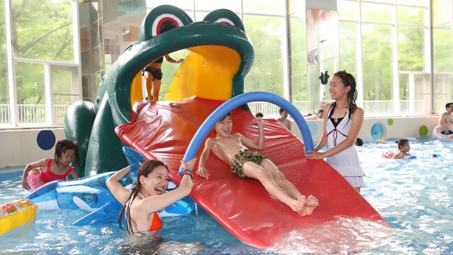全長50mのメインアトラクション「スプラッシュリバー」は、大人から子供までお楽しみいただけます。浅めのプールと傾斜の緩やかな滑り台もあるため、赤ちゃんのプールデビューにもおすすめ。レンタル水着やうきわ、各種アイテムの販売品も幅広く取り揃えています。