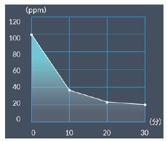 ●試験内容:1m³チャンバー中央に試験資材を設置。初期臭気濃度100ppm。試験資材を稼働させ、検査時点ごとに臭気濃度を測定。