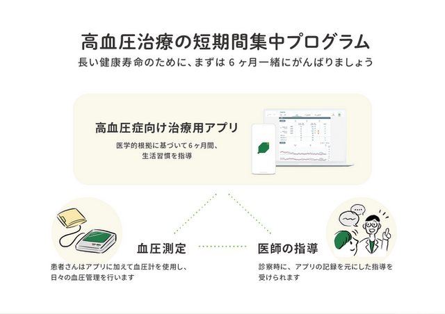 行動変容を促し患者さんの正しい生活習慣の獲得をサポートすることで、継続的な生活習慣の修正と定着が可能となり、減塩や減量を通じた血圧の低下という治療効果をもたらすことを意図しています。