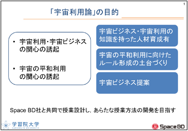 学習院大学(所在地: 東京都豊島区、大学長: 荒川一郎、以下学習院大学)と宇宙産業における総合的なサービスを展開するSpace BD株式会社(本社:東京都中央区、代表取締役社長:永崎将利)は、2023年度4月より学習院大学にて、所属学部・学年にとらわれずに履修可能な全学共通科目として「宇宙利用論」を開講します。2022年3月に産学連携協定を締結し、学習院大学とSpace BDは、大学が提供する文理融合の教育研究に加え、Space BDが展開するビジネスの両面で知見を深める実践的な学びの場の提供を通じ、これからの社会で活躍する人材の育成するためのカリキュラムを開発してきました。Space BDはカリキュラム共同作成・授業の企画及び実施に携わり、主に国際宇宙ステーションを活用したビジネス創出に向けた学習機会を提供します。大学機関と宇宙ベンチャー企業による産学連携での大学カリキュラム開発は国内初(※)の事例となります。