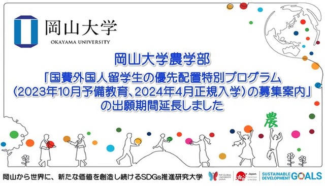 国立大学法人岡山大学(本部:岡山市北区、学長:那須保友)の農学部では、2020年度の文部科学省 国費外国人留学生の優先配置特別プログラムに採択された「開発目標(SDGs)に貢献する人材養成国際農学プログラム(GAP)構築」により、2021・2022年度に引き続き、2023年10月から半年間の予備教育、2024年4月から正規生として入学する外国人留学生と日本人学生から編成される国際農学プログラム(GAP)を募集します。
