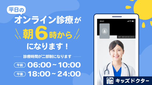 この度、キッズドクターのご利用者様からの「保育園や幼稚園にお子様を預ける前の朝の時間帯での子どもの体調不良で困っている」という声を受け、本日4月19日より医療機関と連携し、平日6時~10時の朝の時間帯のオンライン診療を開始いたしました。