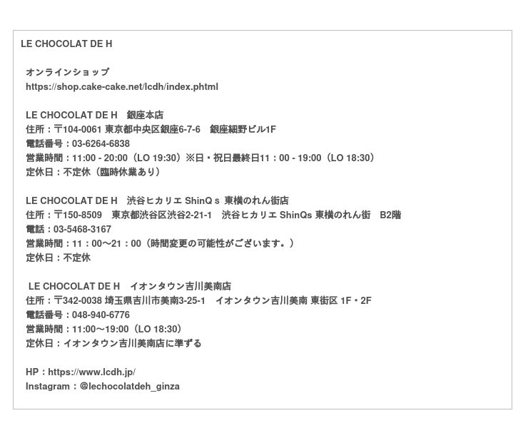 こいのぼりをプリントをしたサブレでショコラガナッシュをサンド。 ギフトにも最適なかわいいお菓子です。 3種類のガナッシュをバターが香るサブレでサンドしたアソート。 【青】ショコラ オ レ フルーティーな酸味とナッティーな香りが特徴のドミニカ産ショコラのガナッシュをサンド。 【赤】フリュイルージュ 甘酸っぱく繊細な香りのフランボワーズとショコラブランを合わせたガナッシュをサンド 【グレー】オランジュ オレンジ果皮から香りを抽出したクリームとオレンジピューレで作ったガナッシュをサンド。 販売店舗:オンラインショップ、銀座本店、渋谷ヒカリエ ShinQs 東横のれん街店、吉川美南店 予約・販売開始:2023年4月20日~ オンラインショップお届け日:2023年4月24(月)~ なくなり次第、終了