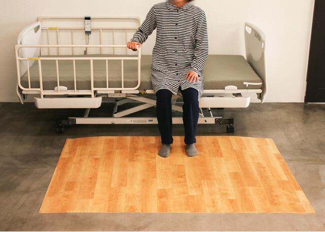そこで「ころやわ」は、医療機関・福祉施設のニーズに合わせ「ベッドサイドに置くだけで、いつでも・どこでも・誰でも簡単に転倒骨折のリスクを低減できる床」を目指し、杖や車いす等利用時や、医療・介護用ベッドの移動時に床が凹まず取り外し不要で、緩衝マットの「敷き忘れ」による事故を改善する製品として開発されました。