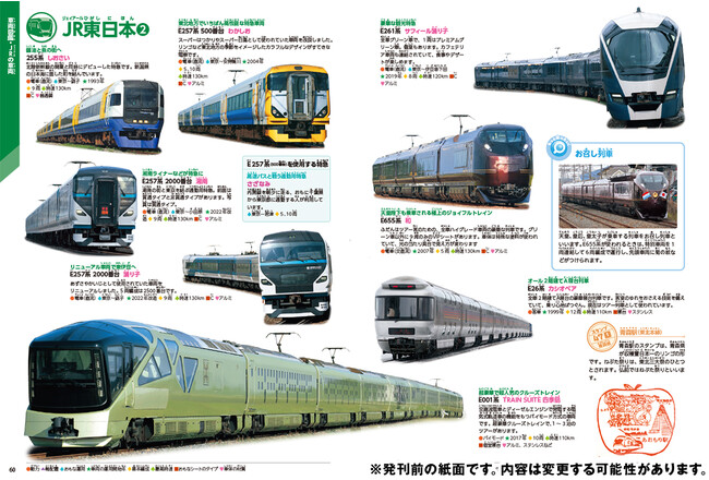 全鉄道会社の情報(本社位置まで)も掲載しており、“鉄道好き”の期待に応える図鑑です。収録数は類書中最多の850点以上。日本全国の最新車両に対応し、2022年9月開業の西九州新幹線「かもめ」や2024年春から運行予定のE8系山形新幹線も掲載しています。