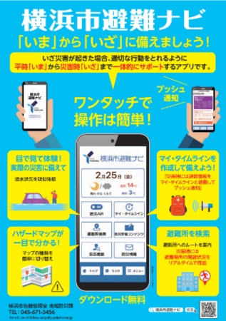 都筑区役所が、ハザードマップの配布や横浜市避難ナビ(スマートフォン用アプリ)の登録促進会を行います。