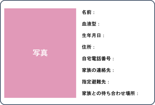 災害によってお子さまや高齢者が家族と離れてしまった場合でも、家族を探すことができる「安心カード」を作成します。必要事項を記入したカードに会場で撮影したご家族皆さまの写真を貼り付けることで、簡単に作成することができます。