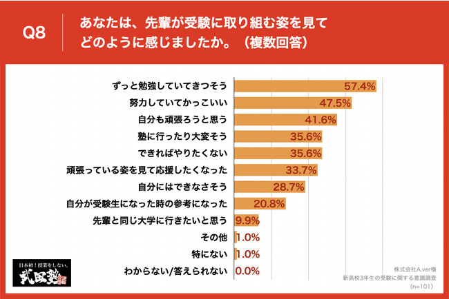 「Q8.あなたは、先輩が受験に取り組む姿を見てどのように感じましたか。(複数回答)」(n=101)と質問したところ、「ずっと勉強していてきつそう」が57.4%、「努力していてかっこいい」が47.5%、「自分も頑張ろうと思う」が41.6%という回答となりました。