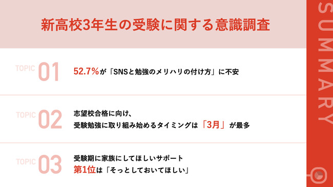 今回の調査では、新高校3年生が、人生における重要イベントである「大学受験」に対して不安やプレッシャーを感じつつも、受験に取り組んだ先輩の姿を思い出し、「自分も頑張ろう」と前に進もうとしていることが分かりました。また、家族としては何か力になってあげたいという思いが強いと思いますが、「静かに見守りながら、応援してほしい」という回答が多く、受験勉強という孤独な戦いに、自分なりのストレス解消法を取り入れながら立ち向かおうとしているようです。受験生の皆様が、実力を出し切り、合格されることをお祈りしています。