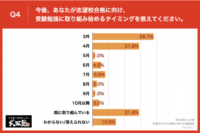 「Q4.今後、あなたが志望校合格に向け、受験勉強に取り組み始めるタイミングを教えてください。」(n=101)と質問したところ、「3月」が28.7%、「4月」が21.8%という回答となりました。
