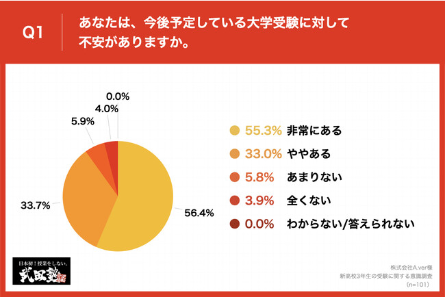 「Q1.あなたは、今後予定している大学受験に対して不安がありますか。」(n=101)と質問したところ、「非常にある」が55.3%、「ややある」が33.0%という回答となりました。