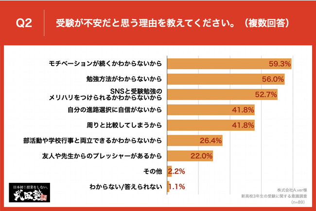 Q1で「非常にある」「ややある」と回答した方に、「Q2.受験が不安だと思う理由を教えてください。(複数回答)」(n=89)と質問したところ、「モチベーションが続くかわからないから」が59.3%、「勉強方法がわからないから」が56.0%、「SNSと受験勉強のメリハリをつけられるかわからないから」が52.7%という回答となりました。