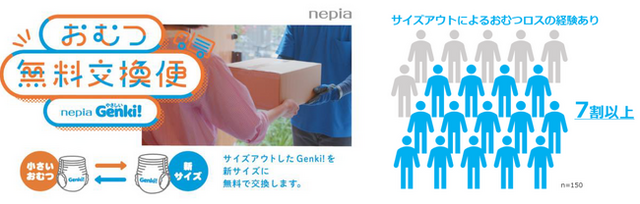 “赤ちゃんも、ママパパも、おむつストレスフリー”をめざす「ネピア Genki!」は、本来なら子供の成長の証であるサイズアウトのタイミングが、親の隠れたストレスになっていることに着目。中途半端に余ったおむつは、処分に困るなどママパパのストレスの原因になっている。その悩みに寄り添うために、サイズアウトしたGenki!のおむつを新サイズに交換する『おむつ無料交換便』を実施。すでに開封したGenki!も、無料で新しいサイズに交換します。赤ちゃんも、ママパパも、地球にも、おむつストレスフリーになることを願っています。