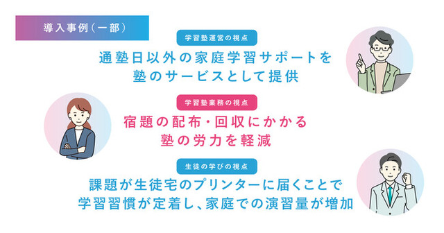 「宿題を忘れた、なくした」「宿題をやる時間がなかった」など、生徒からの宿題の提出が長年の課題でした。「StudyOne」導入後は、塾から生徒宅のプリンターへ当日分の宿題が決まった時間に配信でき、生徒もそのまま迷わずプリントして学習に取り組むことが習慣化され、家庭での演習量が増加し、学力向上につながりました。