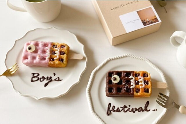 ジャパンリゾート株式会社(本社:京都府京都市/代表取締役:松下美耶)が運営するワッフル専門店「kyocafe chacha (キョウカフェ チャチャ)」は、2023年4月21日(金)~2023年5月5日(金)の期間中、『こどもの日限定 お絵かきデコ京ワッフルBOX 』を販売いたします。たっぷりチョコレートをディップした京ワッフルとチョコペンなどのデコレーションセットの詰め合わせ。自分だけのオリジナル京ワッフルで、楽しく節句のお祝いを。新しい節句のお祝いスタイルをお楽しみいただけます。節句のお祝いにはもちろん、作って楽しいギフトとしても◎。オリジナルの京ワッフルで笑顔いっぱいのお時間をお過ごしくださいませ。