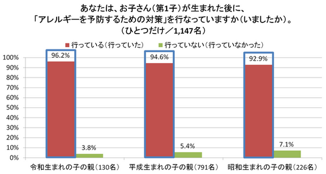 「あなたは、お子さん(第1子)が生まれた後に、『アレルギーを予防するための対策』を行なっていますか(いましたか)。」と聞いたところ、“行っている(いた)”と答えた割合は、「令和」生まれの子の親が96.2%、「平成」が94.6%、「昭和」が92.9%と、3世代ともほぼ同じ結果に。