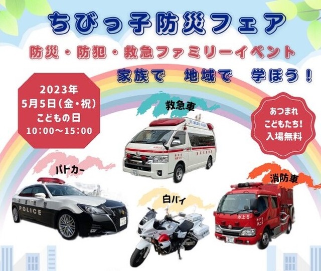 名称;「ちびっ子 防災フェア」 日時;2023年5月5日(金・祝)10:00~15:00 ※雨天決行 場所;ポートアイランド市民広場 (神戸市中央区港島中町6丁目9番地2) 内容;緊急車両(消防車・救急車など)展示/子供用警察制服・消防服を着て写真撮影/水消火器体験/煙体験/AED体験/ 交通安全教室/消防レスキュー隊 ロープ降下(13:30~)/消防音楽隊による演奏(14:30~)ほか ※状況によりイベント内容が変更になる場合があります