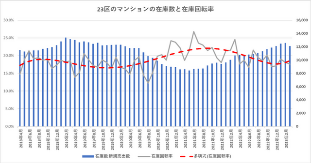 東京都23区の中古マンション価格は、いまだ高い水準で推移。しかし、ここ数ヶ月は高止まり感があり、在庫数も増えています。 ■在庫数と在庫回転率 グラフ1:東京都23区の在庫数と在庫回転率