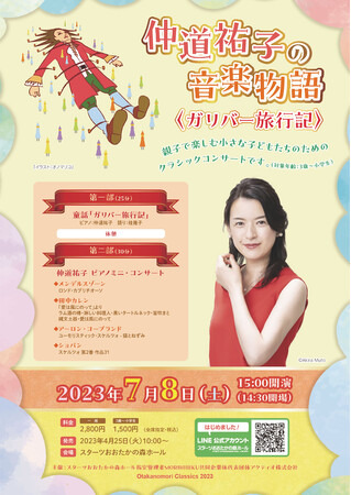『仲道祐子の音楽物語〈ガリバー旅行記〉』日時:2023年7月8日(土)15:00開演(14:30開場)会場:スターツおおたかの森ホール(千葉県流山市おおたかの森北1-2-1)【第一部】童話「ガリバー旅行記」仲道祐子(ピアノ)&桂幾子(語り)作曲 新田祥子イラスト オノマリコ【第二部】ピアノミニ・コンサート仲道祐子 <仲道祐子ピアノミニ・コンサート予定曲目>◆メンデルスゾーン: ロンド・カプリチオーソ◆田中カレン:「愛は風にのって」よりラム酒の樽・淋しい料理人・黒いタートルネック・笛吹きと縄文土器・愛は風にのって◆アーロン・コープランド:ユーモリスティック・スケルツォ - 猫とねずみ ◆ショパン: スケルツォ 第2番 作品31(※曲目は変更になる場合があります) ■出演童話「ガリバー旅行記」仲道祐子(ピアノ)桂幾子(語り)■主催スターツおおたかの森ホール指定管理者MORIHIBIKU共同企業体代表団体アクティオ株式会社■チケットカンフェティHP・TEL 4月25日(火)10:00発売開始前売・当日とも 一般2,800円3歳~小学生1,500円(全席指定、税込)※2歳以下の入場はできません。※お一人様6枚まで。※別途、各種手数料(発券手数料など)がかかります。※車いす席については、スターツおおたかの森ホールにお問合せください。 ■備考・新型コロナウイルス感染症対策の状況により、販売方法等を変更する場合があります。・お客様都合によるチケットの変更・返金はお受けできません。・最新情報は随時HPにてお知らせいたします。 ■ご来場のお客様へ・ご来場前に体調を確認し、発熱等のある方はご遠慮ください。 ■お問合せスターツおおたかの森ホールチケットセンター04-7186-7638(8:30~22:00)※受付時間は変更になる場合があります。