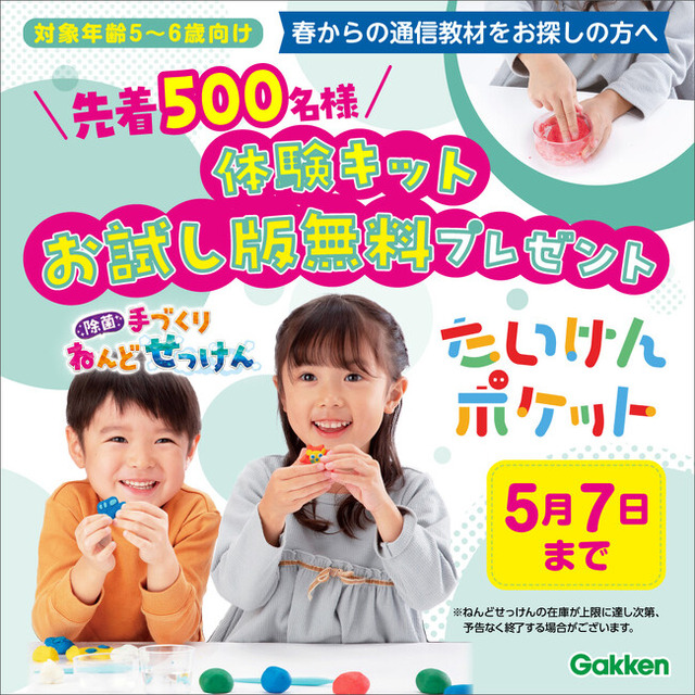 株式会社 学研ホールディングス(東京・品川/代表取締役社長:宮原博昭)のグループ会社、株式会社 Gakken(東京・品川/代表取締役社長:五郎丸徹)が運営する、5・6歳(年長)むけのサービス『たいけんポケット』は、5~6歳児の保護者様を対象に数量限定で体験キット「手作りねんどせっけん」を無料プレゼントします。応募締め切りは2023年5月7日(日)までです。