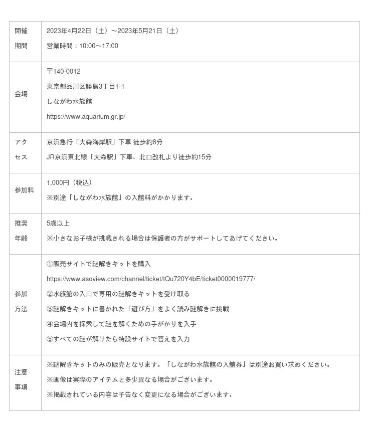 会場となる「しながわ水族館」ではイベント期間中、謎解きキットを専用ウェブサイトにて販売。予約サイト(アソビュー)から事前購入をして水族館を訪れることで、本謎解きイベントに参加することができます。