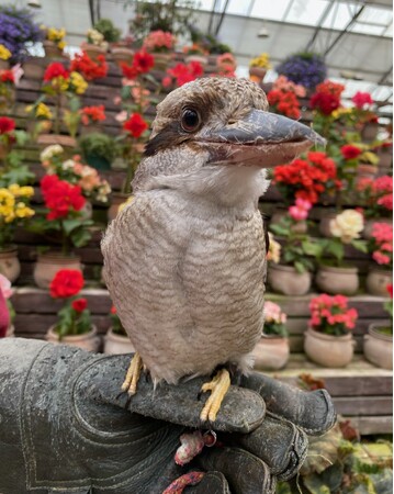13:30のバードショー後の腕のせ体験出動はワライカワセミのゲラちゃんです。ゲラちゃんはこの春に富士花鳥園に来たばかりですが、なんというか態度はでかく、堂々としています。ゲラちゃんの大笑いが聞けた人はきっと幸運が舞い込みます。