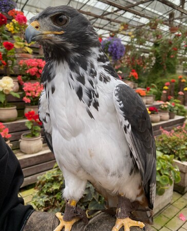 10:30のバードショー後、一番手として腕のせ体験に出演するのはヨゲンノスリのアポロン。富士花鳥園のバードショーのスターとして長年活躍していた大型の鷹です。