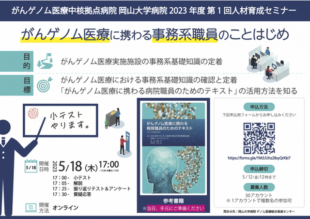 今回、がんゲノム医療に携わる事務系職員を対象として、がんゲノム医療中核拠点病院 岡山大学病院 2023年度第1回人材育成セミナー「がんゲノム医療に携わる事務系職員のことはじめ(小テストの解説)」を、2023年5月18日(木)にオンラインで開催することとなりました。