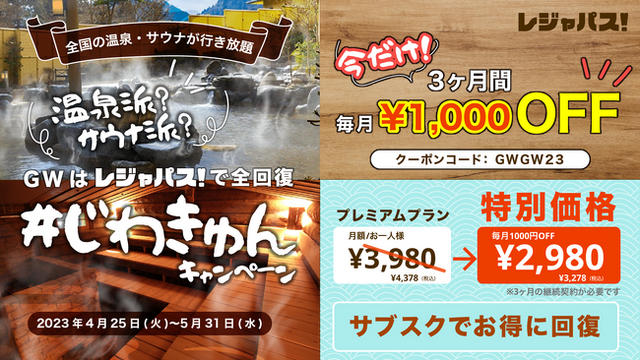 日本最大(※)のレジャー・エンタメ定額制遊び放題サービス「レジャパス」を運営する株式会社ORIGRESS PARKS(本社:東京都品川区、代表取締役社長:吉武優)は、2023年4月25日(火)~5月31日(水)の期間中、温泉・サウナに行けば行くほどお得になる「温泉派?サウナ派?GWはレジャパスで全回復 #じわきゅん キャンペーン」を開催します。さらに新規会員さまには、プレミアムプランが3ヶ月間毎月1000円OFFになります。