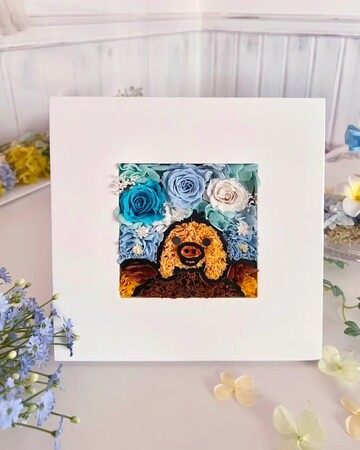 背景はバラやかすみ草、あじさい、カーネーションなどのプリザーブドフラワーを使用。キャラクター部分はあじさいの花びらを貼り絵のように一枚ずつ貼り合わせて表現しています。