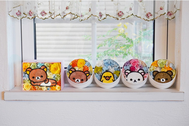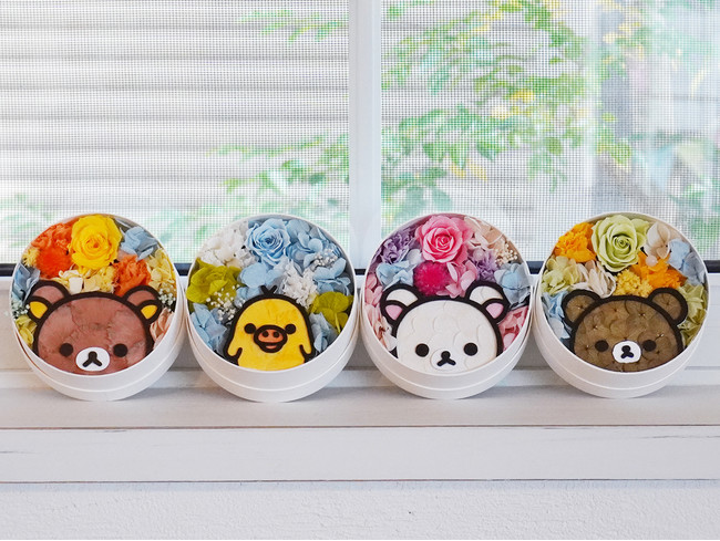 こちらは、お花の種類はキャラクターが丸い窓からのぞいているような構図が楽しい、コロンとかわいい「ごゆるりリラックマフラワー まるBOX」。左から順に、リラックマ、キイロイトリ、コリラックマ、チャイロイコグマの4種類から選べます。