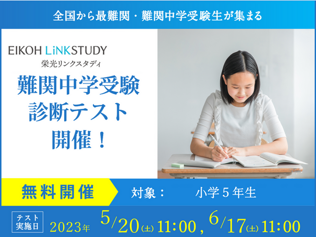 株式会社増進会ホールディングス(Z会グループ)のグループ会社、株式会社栄光(本社:東京都千代田区 代表取締役社長:下田勝昭)が運営するオンライン進学塾「EIKOH LiNKSTUDY(栄光リンクスタディ)」は、難関中学進学を目指す小学5年生を対象に「難関中学受験診断テスト」を2023年5月20日(土)、6月17日(土)午前11時から実施します。