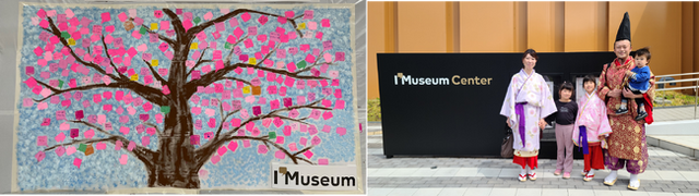 スポンジスタンプでI’Museum Centerのロゴマークをペイントし、巨大な桜の木をつくりあげるワークショップを開催しました。思い思いの場所に桜の花をペイントいただき、その上に博物館へのコメントを記載いただきました。そして、約200人で一つの大きな桜の木を完成させました。