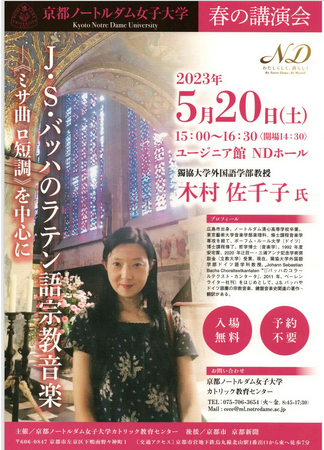 【開催概要】春の講演会「J.S.バッハのラテン語宗教音楽―《ミサ曲ロ短調》を中心に」◆日時 : 2023年 5月20日(土)15:00~16:30(開場14:30)◆場 所 : 京都ノートルダム女子大学 NDホール◆講師 : 木村 佐千子 氏(音楽学者・獨協大学外国語学部教授)◆参加費 : 無料◆申し込み : 予約不要 当日会場に直接お越しください主 催: 京都ノートルダム女子大学カトリック教育センター 後 援: 京都市 京都新聞 【講演概要】バッハはルター派の教会音楽家でしたが、カトリックと同じラテン語のミサ式文にも作曲しました。本講演ではバッハが作曲・筆写したラテン語宗教音楽を概観し、特に《ミサ曲 ロ短調》BWV 232に注目します。この曲はバッハが最晩年に完成させたものの生前に全曲演奏されなかった特殊な作品です。職務上求められていなかったにもかかわらず晩年のバッハはなぜこの大作の完成に力を注いだのか。転用楽章の多さや歌詞がラテン語であることを手がかりに考えていきたいと思います。講演で中心的に扱うバッハの《ミサ曲 ロ短調》を予め聴いておいていただくと、より理解が深まると思います。【講師プロフィール】広島市出身。ノートルダム清心高等学校卒業、東京藝術大学音楽学部楽理科、修士課程音楽学専攻を経て、ボーフム・ルール大学(ドイツ)博士課程修了。哲学博士(音楽学)。1992年度安宅賞、2020年辻壮一・三浦アンナ記念学術奨励金(立教大学)受賞。現在、獨協大学外国語学部ドイツ語学科教授。Johann Sebastian Bachs Choraltextkantaten “(『バッハのコラールテクスト・カンタータ』、2011年、ベーレンライター社刊)をはじめとして、J.S.バッハやドイツ語圏の宗教音楽、鍵盤音楽史関連の著作・翻訳がある。以上