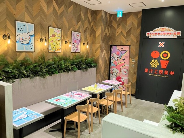 2店舗限定で実施する店内装飾は、現在「果汁工房果琳」他 フルーツジュースバー店舗で開催中の、対象のジュース購入で「2023年サンリオキャラクター大賞」に投票できるコラボ企画の開催を記念したものです。